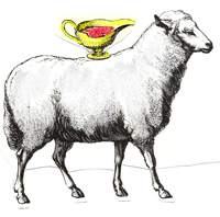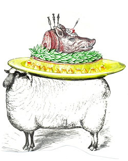 A dozen doors opened simultaneously on the far side of the sala, where the favoured seats were. As if kicked from behind, a large sheep rushed in from every door, each wearing a kind of harness with an elaborate saddle strapped to its back. On the saddles sat silver salvers heaped with food. As the sheep trotted around the U-shaped table, Ravageurs turned and dragged whatever they fancied from the nearest salver onto the filthy leather tablecloths.