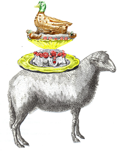 A dozen doors opened simultaneously on the far side of the sala, where the favoured seats were. As if kicked from behind, a large sheep rushed in from every door, each wearing a kind of harness with an elaborate saddle strapped to its back. On the saddles sat silver salvers heaped with food. As the sheep trotted around the U-shaped table, Ravageurs turned and dragged whatever they fancied from the nearest salver onto the filthy leather tablecloths.